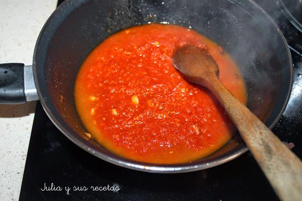 Añadimos el comino molido y el vino. Dejamos cocer hasta que el vino reduzca a la mitad y añadimos la salsa de tomate.