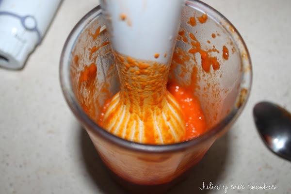 La dejamos cocer a fuego lento unos minutos y la trituramos en el vaso de la batidora, hasta que quede muy fina.