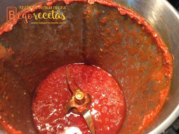 Trituramos el tomate frito, el agua, los ajos enteros, los cominos, la guindilla y la sal, Batimos muy bien.