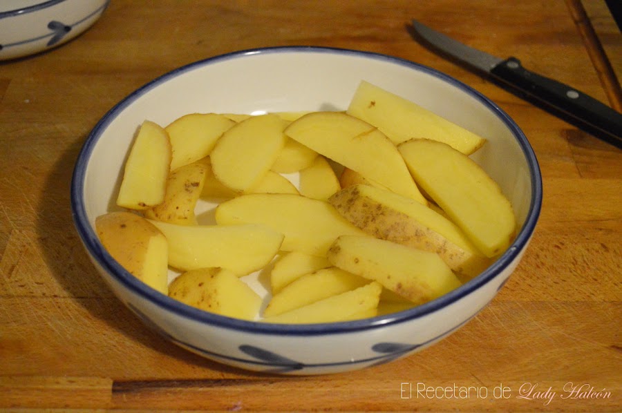 Lava bien las patatas, córtalas a gajos sin quitarles la piel y colócalas en un bol apto para el microondas.