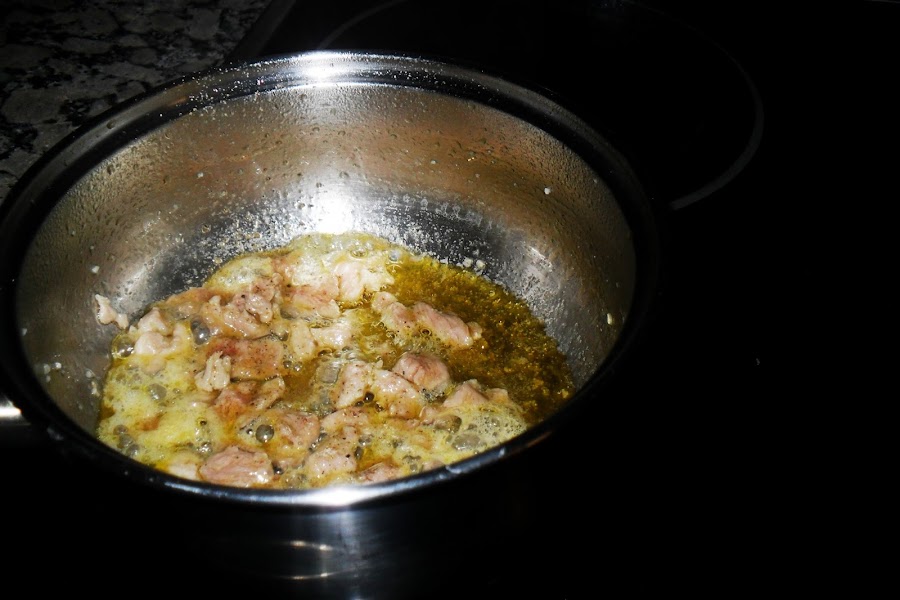 Ponemos la margarina al fuego en una sartén, echamos los ajos picados, el pimiento y los filetes troceados.