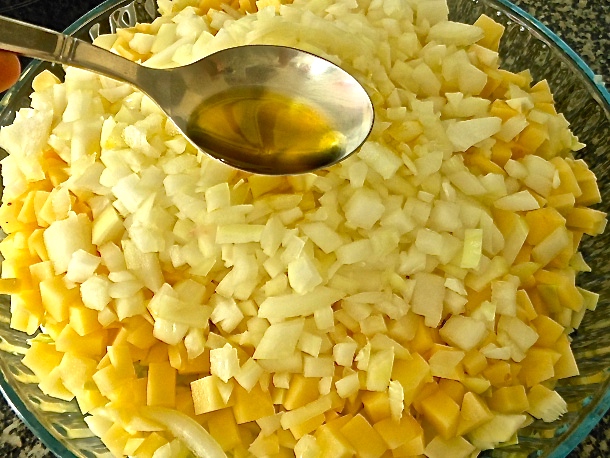 Seguidamente añade la cucharadita de sal fina, la media de pimienta blanca molida y las cuatro cucharadas de aceite de oliva. Remueva bien el contenido del recipiente usando una cuchara o con las propias manos hasta que todo esté bien mezclado.