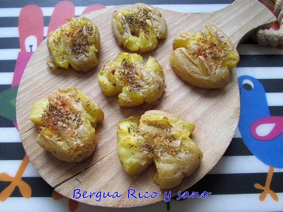 Los sabores concretos dependen de lo que tengas por casa ese día, pero te cuento cómo las suelo hacer yo. Yo hice 12 patatitas del tamaño de una nuez para 2 personas (bueno, 2 de ellas eran del tamaño de una monedita).