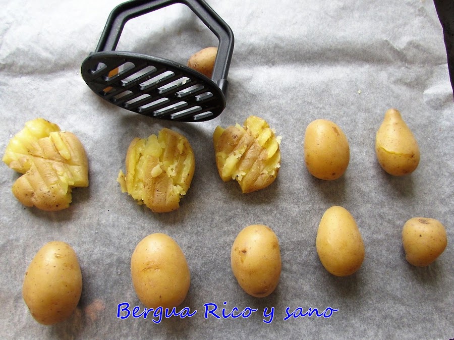 4. Una vez hervidas, las colocamos sobre papel de horno en una bandeja de horno. Y lo siguiente es chafarlas; con el puño o, si queman, con ayuda de un tenedor o de un prensa-patatas. Lo importante es no romperlas demasiado; sólo las chafamos sin que se descompongan en trozos independientes; que sigan en una pieza.