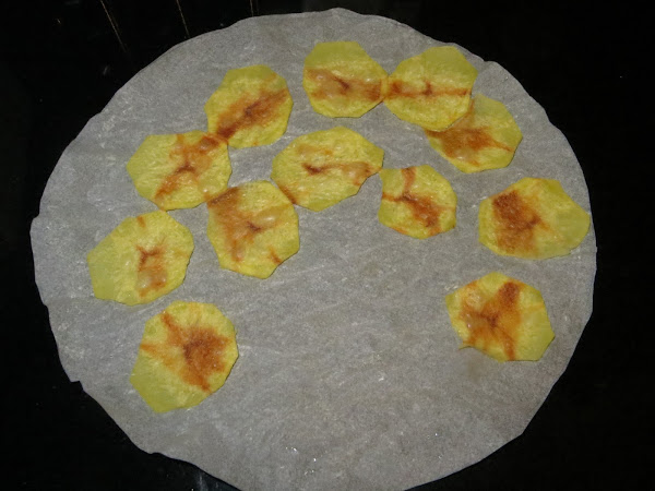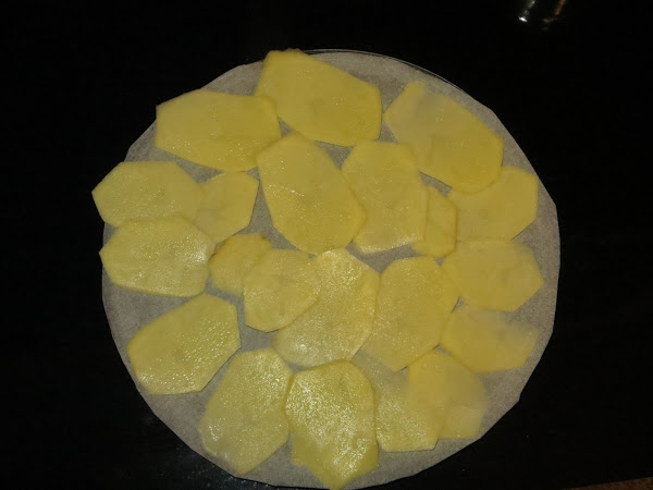 Colocamos un papel para horno en la bandeja del microondas, cortarlo redondo y de la misma medida. Ahora con una mandolina o con un cuchillo cortamos las patatas muy finas, las colocamos encima de la bandeja del microondas y las ponemos durante cinco minutos a 700 watios, pasado ese tiempo abrimos la puerta vemos como van y las dejamos cuatro o cinco minutos más a la misma temperatura hasta que veamos que están doradas.