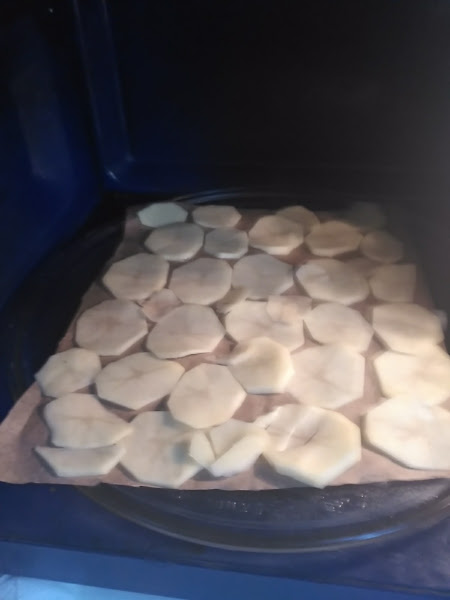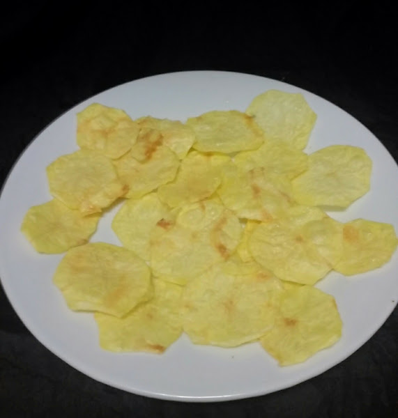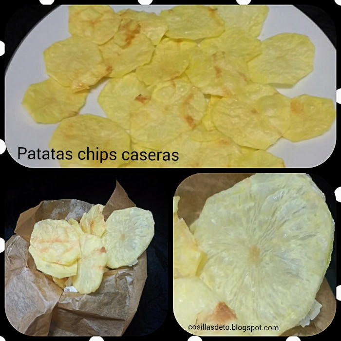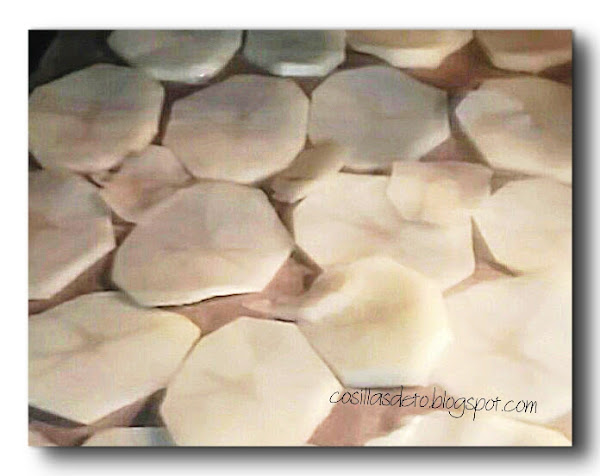 Se corta las patatas finas (con cuchillo, mandolina, o pela patatas) en rodajas.