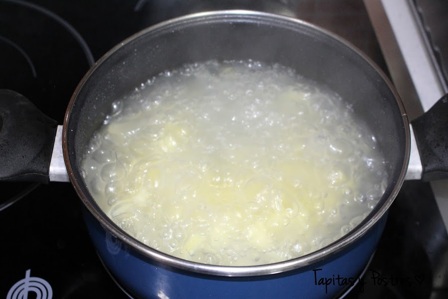 Primero vamos a preparar las patatas, las pelamos y las cortamos a cuadrados no muy pequeños y las cocemos en abundante agua con sal hasta que estén tiernas. Unos diez minutos. Para saber si están tiernas, las pinchamos con un cuchillo y si entra con facilidad ya están listas.