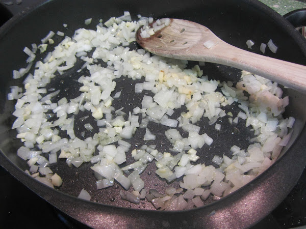 Picamos en juliana finita el ajo y la cebolla. En una cazuela baja, echamos un chorreón de aceite de oliva, y los rehogamos a fuego medio.