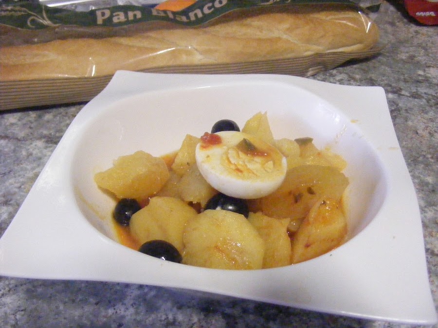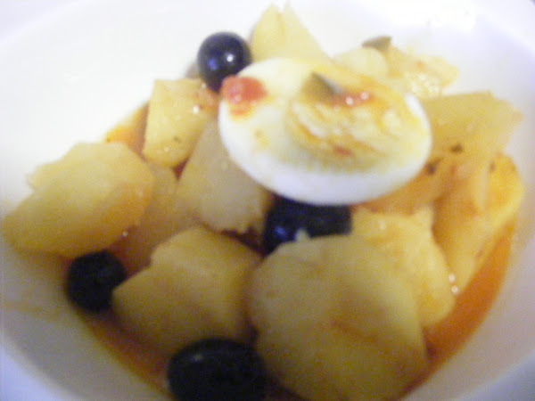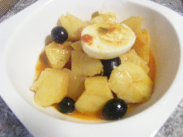 Aparte se cuecen unos huevos ,se pelan y trocean y se añaden al guiso junto con las aceitunas a la hora de servir.