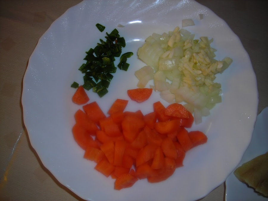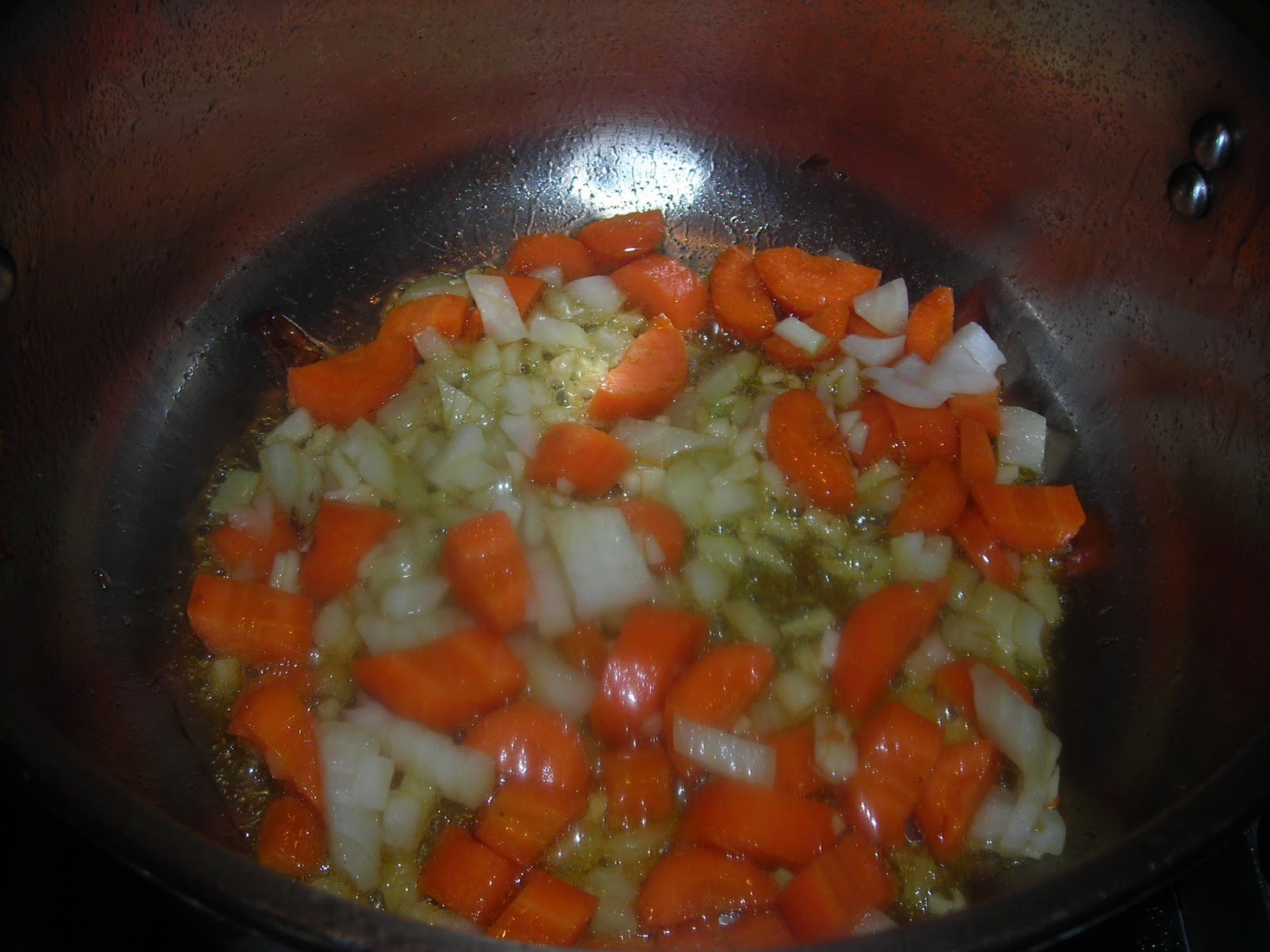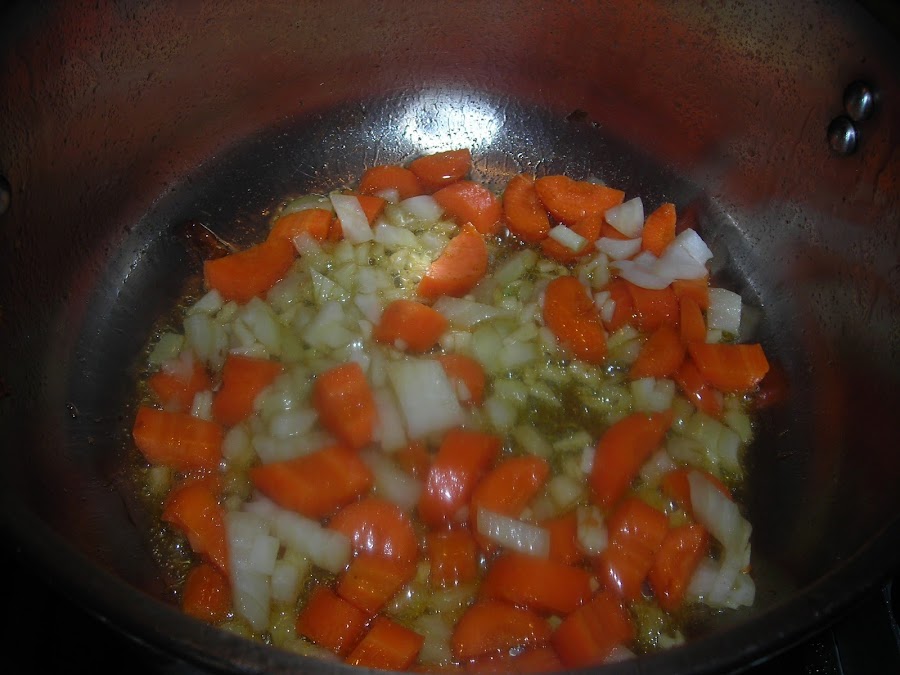 freimos las zanahorias peladas y cortadas en tacos, añadimos la cebolla picada y la pochamos un poco, el diente de ajo cortado pequeñito
