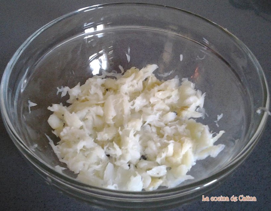 Deshacer los trozos de bacalao aplastándolos ligeramente con un tenedor y reservarlos en un bol.