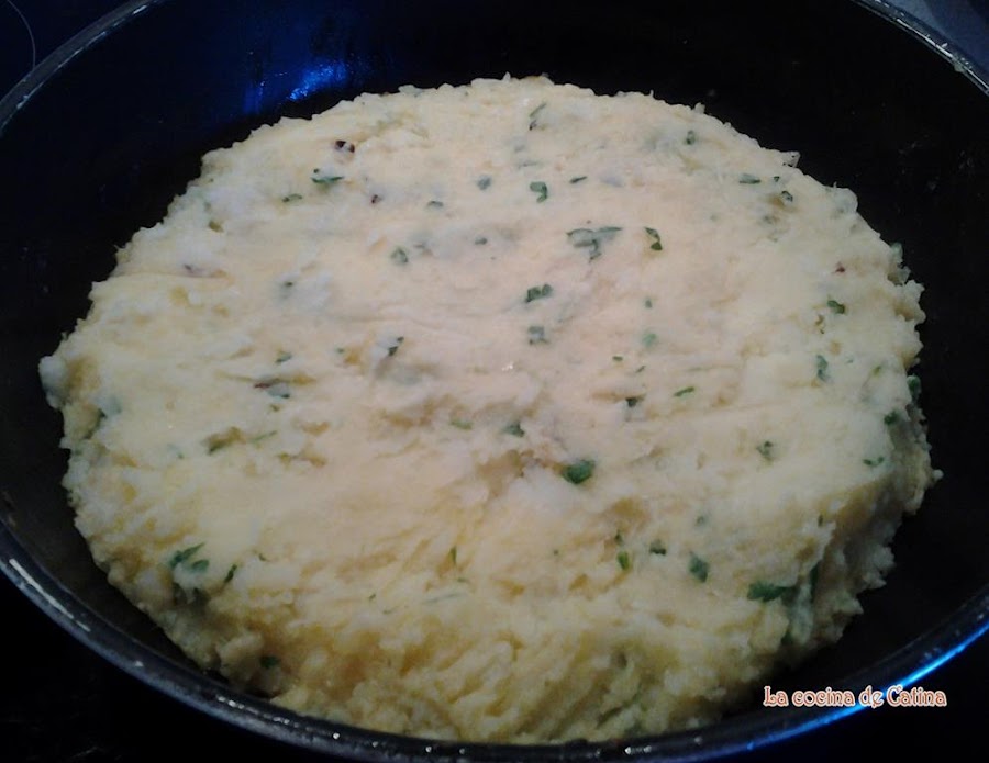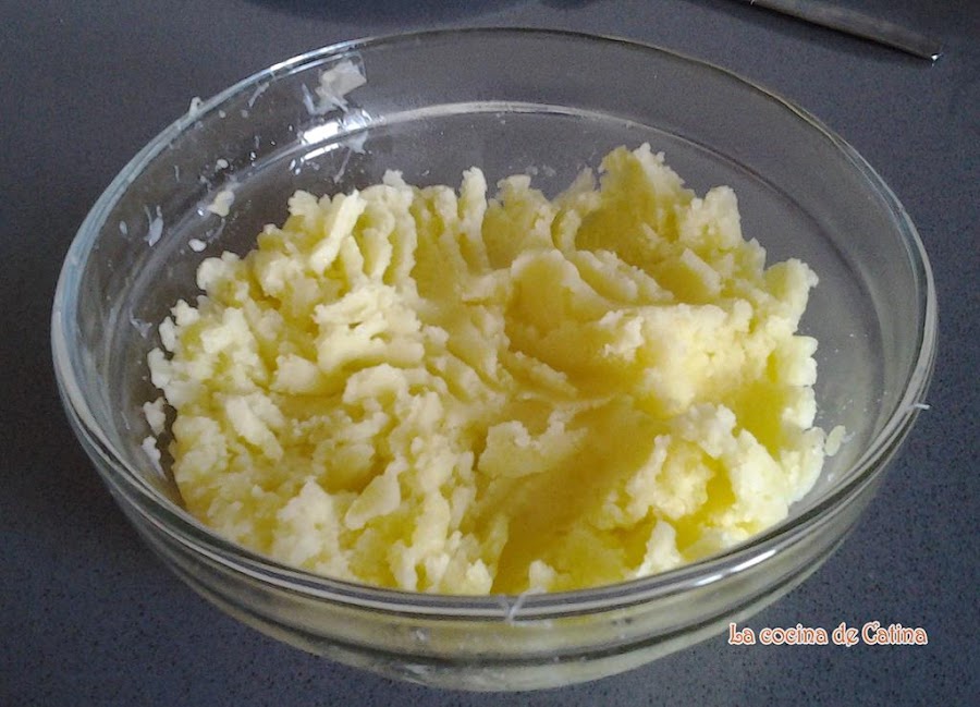Cocer en una cazuela las patatas con su piel, en abundante agua hirviendo con sal durante unos 30 minutos. Escurrirlas, dejarlas enfriar y pelarlas, después, machacarlas con un tenedor.