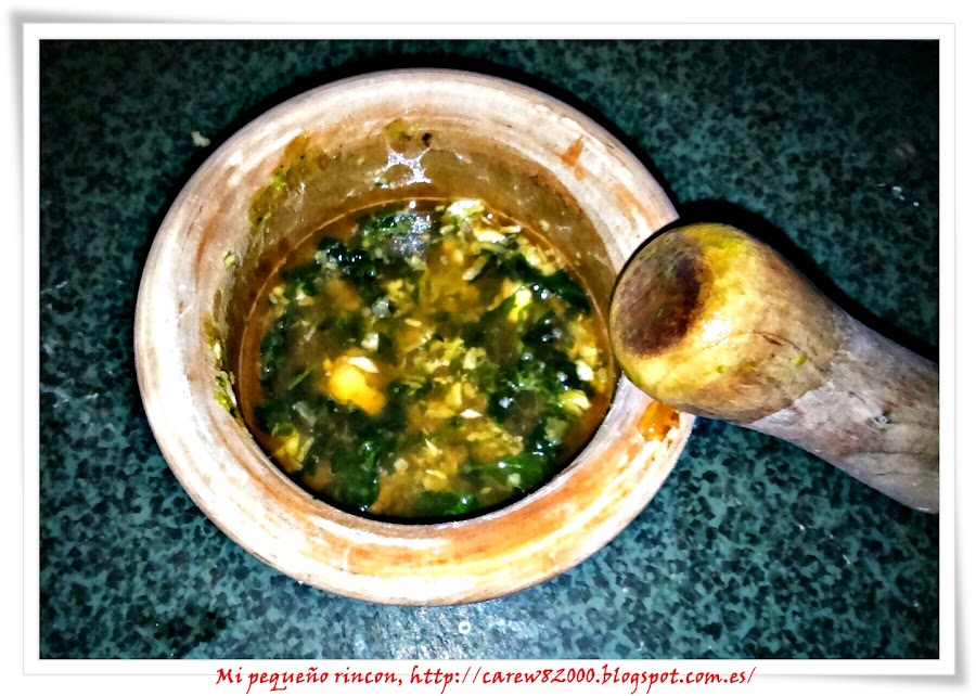 Preparamos un majado con los ajos, el perejil y la copa de vino blanco y se lo añadimos al guiso mezclándolo bien.