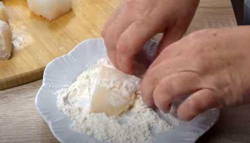 En primer lugar preparamos el pescado: cortamos el bacalao en dados medianos. Yo he usado bacalao desalado a punto de sal.Seguido, pasamos cada trozo de pescado por harina de trigo ligeramente, quitando el exceso.