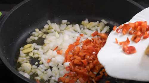 Ahora, bajamos el fuego a medio y en el mismo aceite echamos los dientes de ajos pelados y laminados. Mantenemos unos segundos para que suelte el aroma y añadimos la cebolla y el pimiento rojo en trocitos pequeños, un poquito de sal y dejamos rehogar unos minutos.