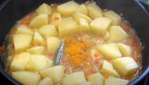 A continuación, le ponemos una cucharadita de cúrcuma y seguidamente cubrimos las patatas con caldo de pescado.