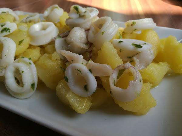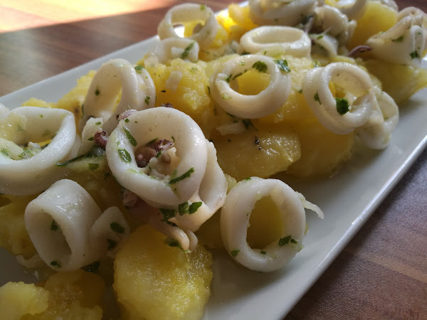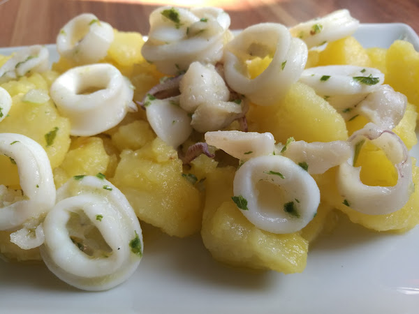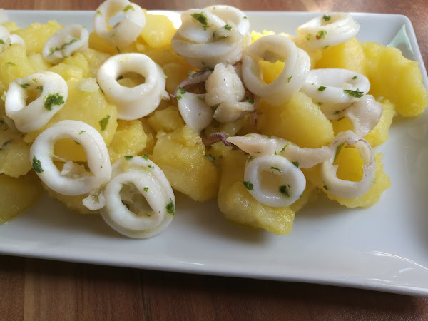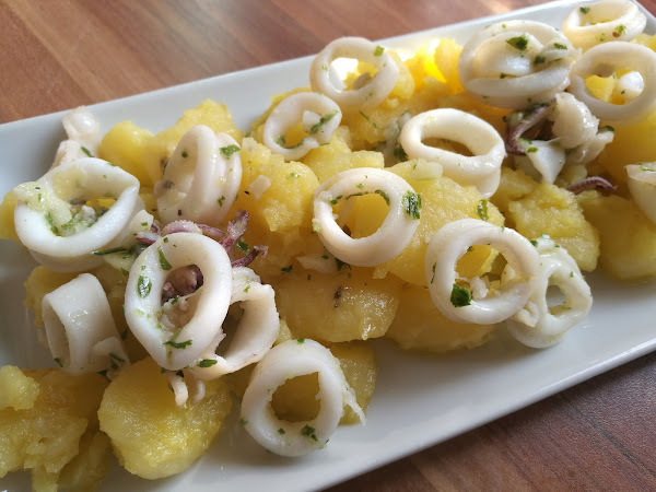 - Picar los ajos y dorar en una sartén, añadir los calamares en aros y cocinar 3 minutos. Salpimentar, añadir el perejil y servir por encima de las patatas.