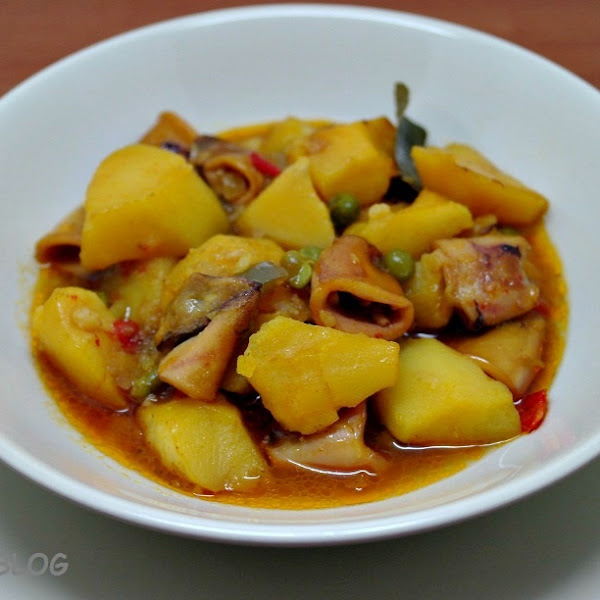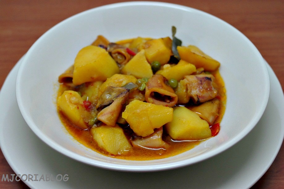 Añadir al refrito los calamares y darles unas vueltas, añadir las patatas, remover.