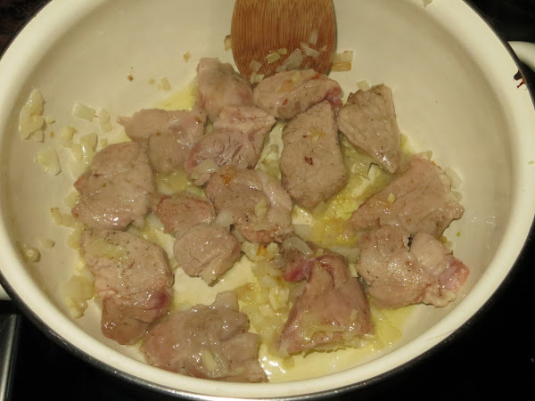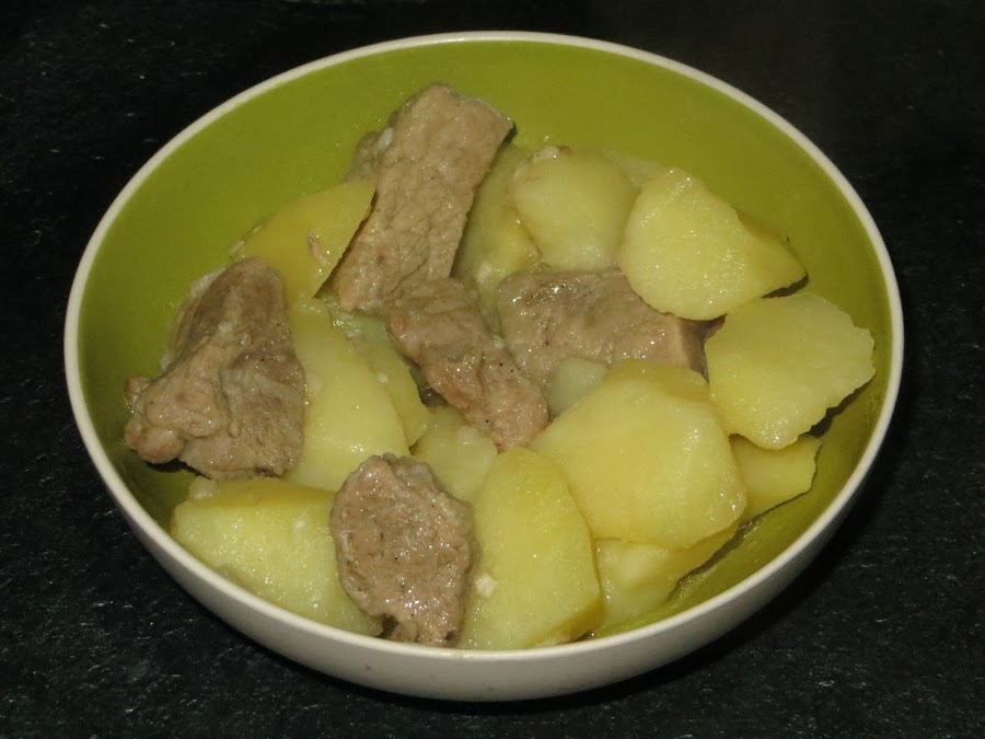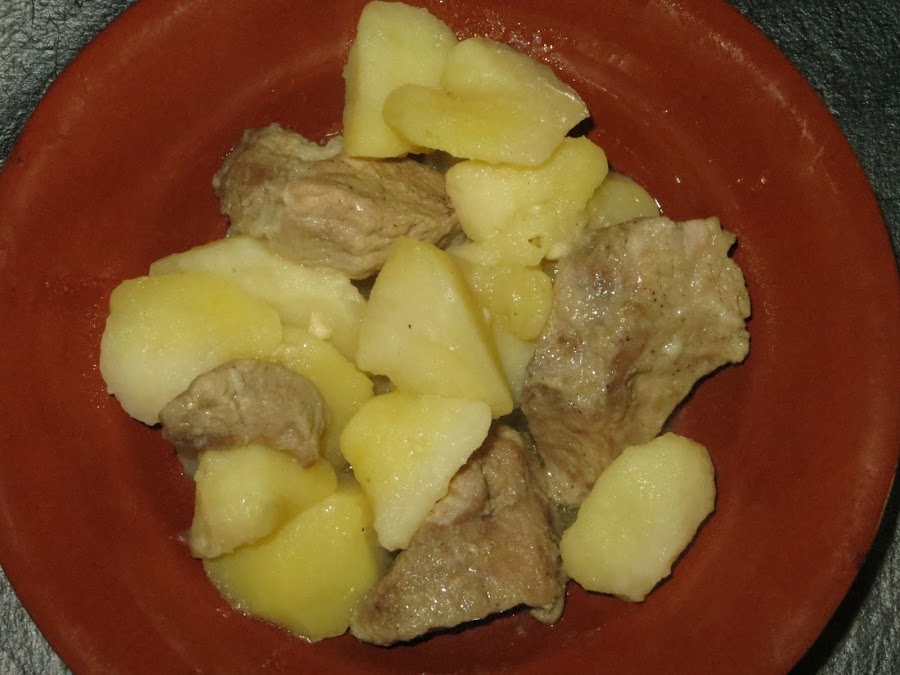 Cuando el vino se haya evaporado, se cubre la carne con agua, añadimos una cucharadita de sal y se deja de hora y media a dos horas, dependerá del tamaño de la carne y de la parte que hayáis escogido. Cuando vemos que la carne está blanda, pelamos las patatas y las cortamos en cachelos para que suelte el almidón y espese un poco el caldo, si todavía lo queréis más espese cuando se hayan cocido las patatas rompéis alguna que le ofrecerán mayor espesor.