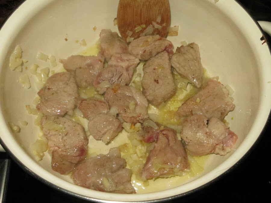 Lo primero que hacemos es partir el ajo y la cebolla en trozos pequeños y lo añadimos a una cacerola con un poco de aceite. Echamos también la hoja de laurel y salamos. Cuando veamos que la cebolla está pochada, añadimos la carne y subimos el fuego. Cuando empiece a coger color la carne. Echamos el vino blanco y vamos dando una cuchara de palo en el fondo de la cacerola para sacar todos los jugos, eso en el lenguaje culinario se denomina desglasar.