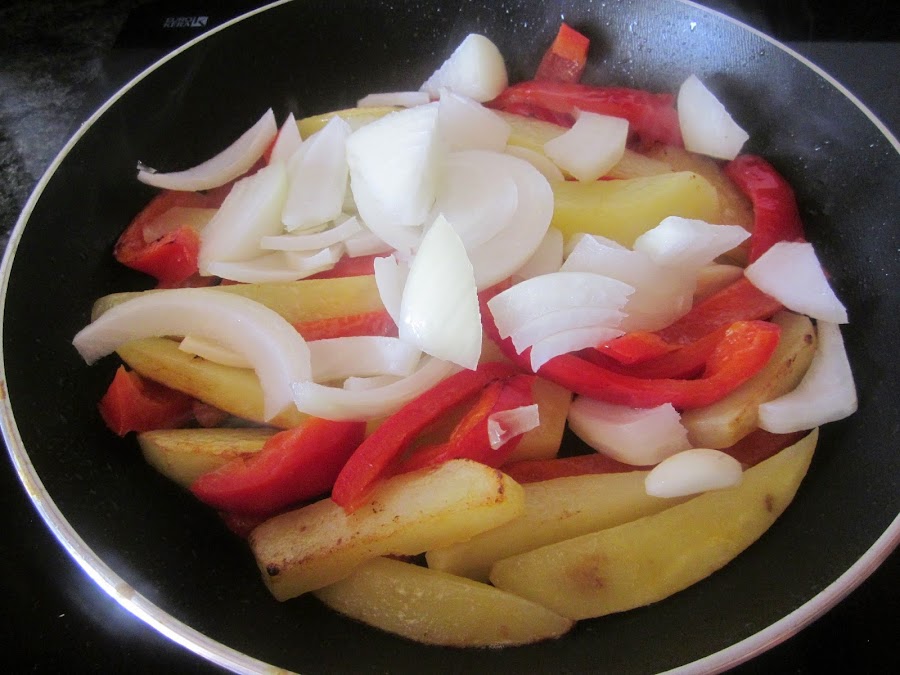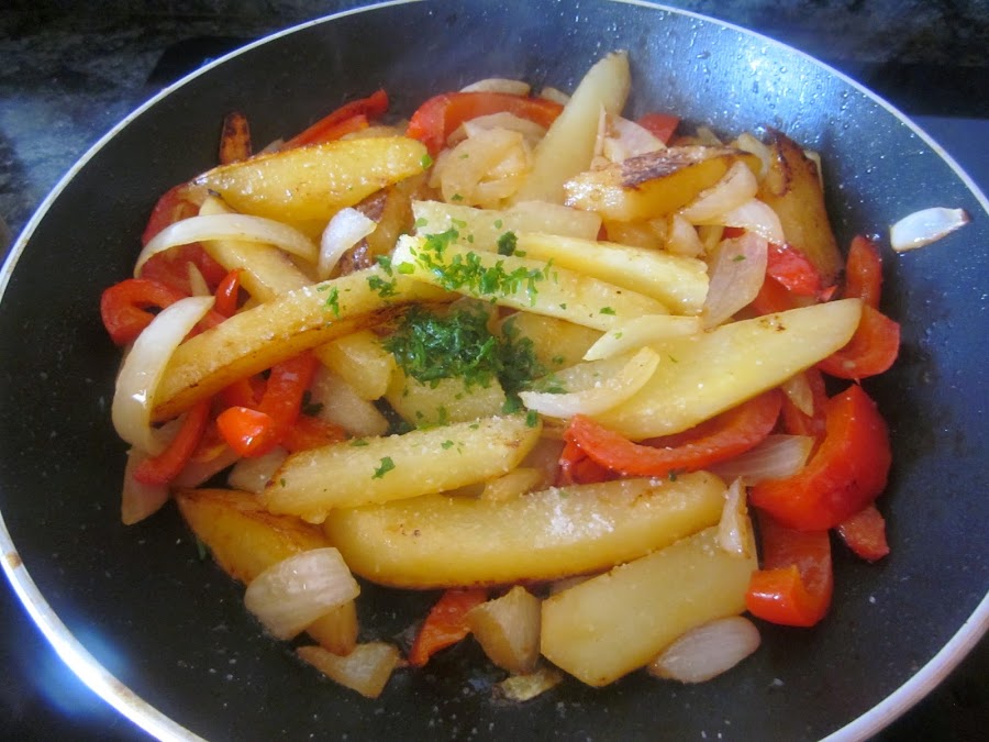 Estas patatas con pimientos son una excelente guarnición para carnes o pescados.