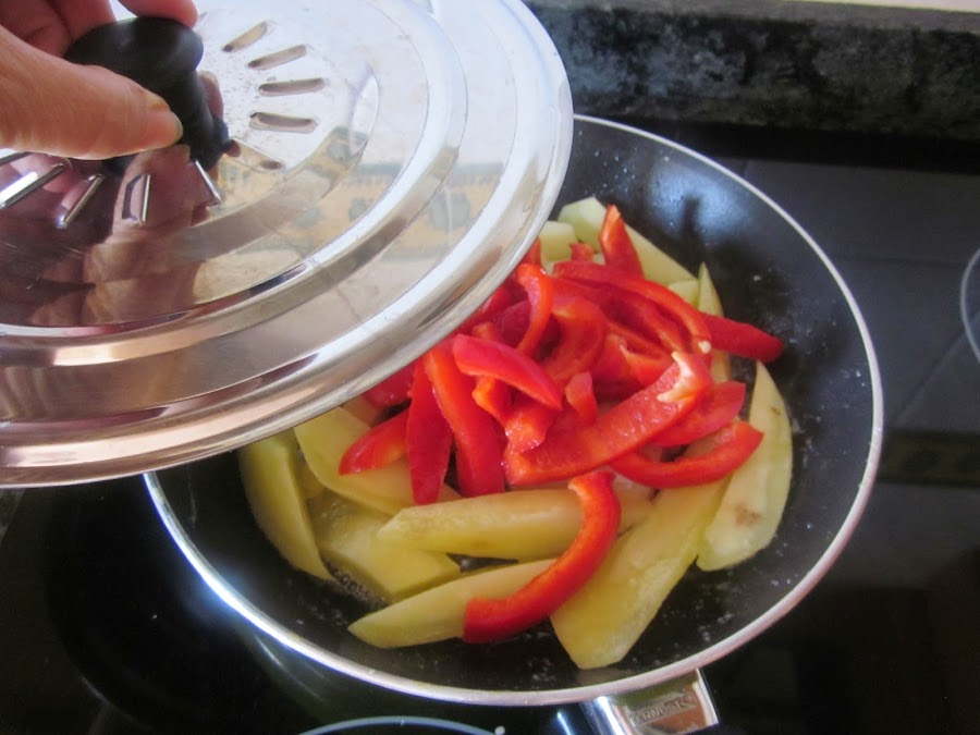Los pimientos igual, lo ponemos en la sarten a fuego medio, sofriendo, tapamos cuando no estemos removiendo. Salteamos para remover.