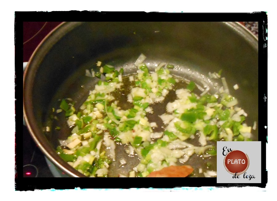 Pues empezamos picando el ajo, la cebolla y el pimiento y preparamos un sofrito con ellos al que añadimos también la pimienta (cuatro o cinco granos), el laurel y el azafrán.