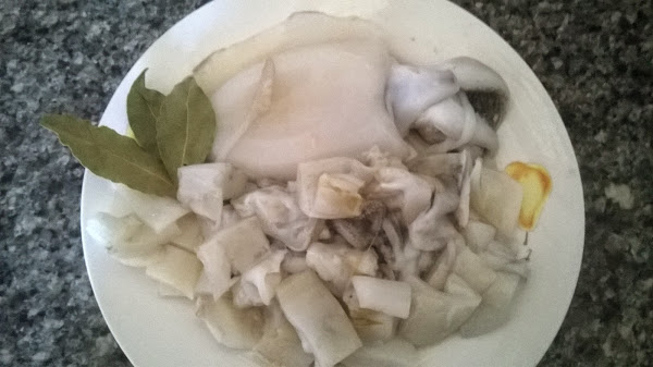Limpiar bien el Choco y trocearlo en cuadrados de unos 2 cm. de lado.