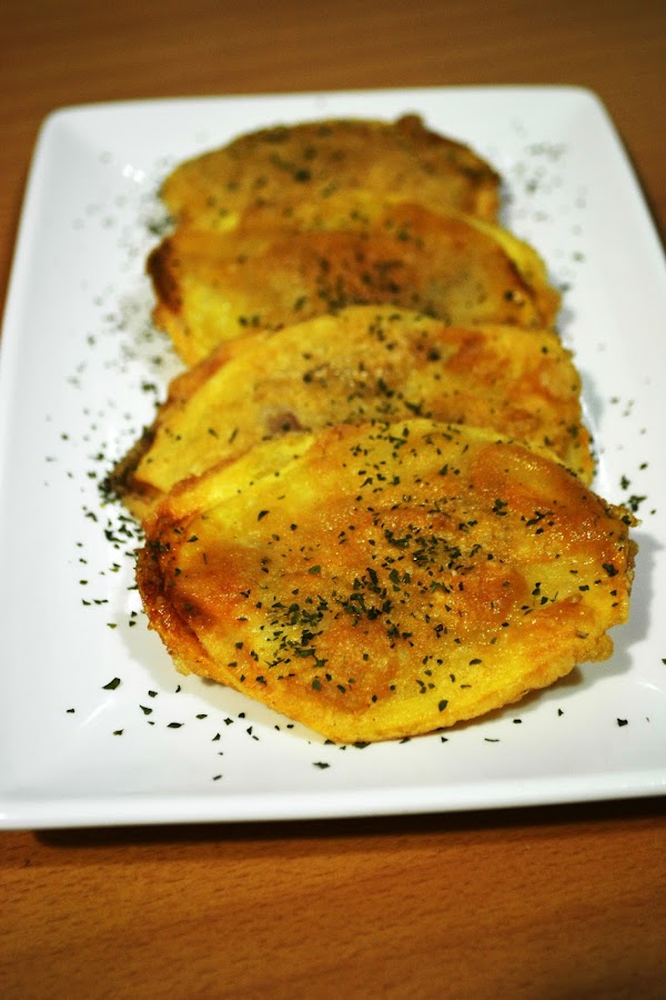 Se trata de las mismas patatas, solo que esta vez van rebozadas, y os aseguro que gustan y sorprenden a partes iguales, porque no se sabe qué es hasta que se da el primer “bocao”.