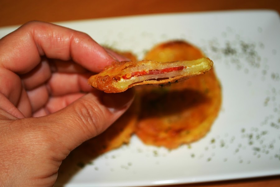 Pasamos por harina, huevo y freímos con el aceite caliente... A esperar hasta que estén doradas por ambos lados. Antes de servir, las dejaremos sobre un papel de cocina para que suelten el exceso de aceite.