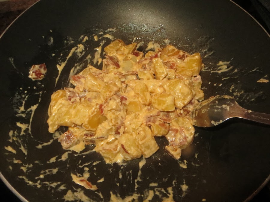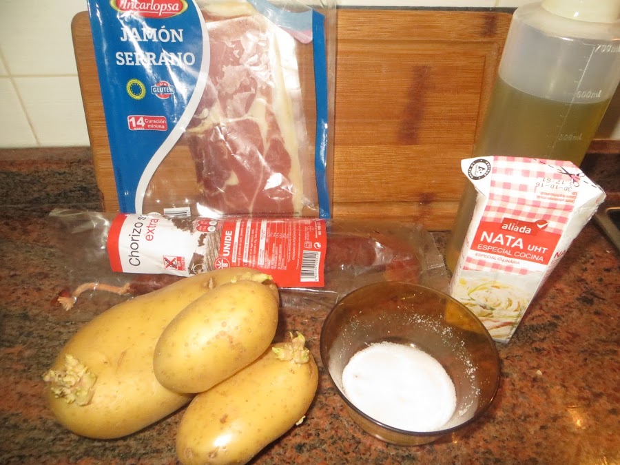 En otra sartén ponemos con una cucharada de aceite a freír el jamón y el chorizo y cuando ya han tomado color, echamos las patatas que habremos escurrido con anterioridad en un papel y le damos varias vueltas para que cojan todo el sabor del jamón y del chorizo. A continuación, vamos añadiendo nada, eso dependerá del gusto de cada uno si os gusta con más salsa añadir más nata (crema de leche) que la que pongo en la receta. Cuando estén todas las patatas cubiertas, las sacáis y ya están listas para degustar.