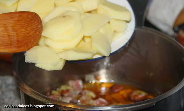 Añadimos el chorrito de vino blanco y las patatas laminadas. Movemos bien.