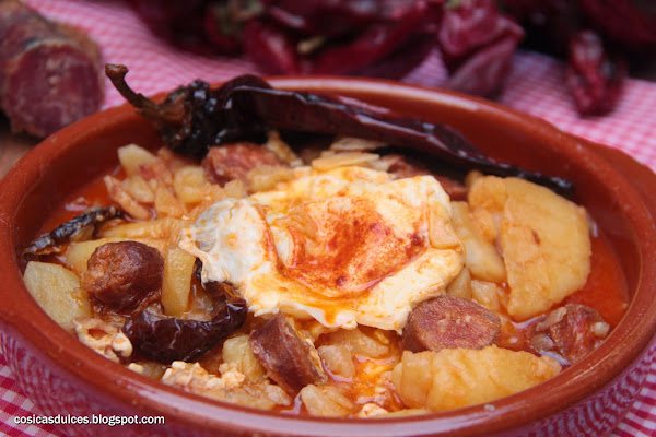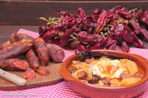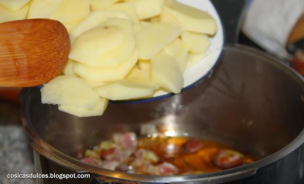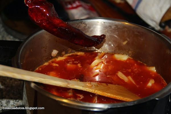 Cocinamos durante un par de minutos y añadimos el pimentón, el agua y los pimientos choriceros que habremos frito previamente.