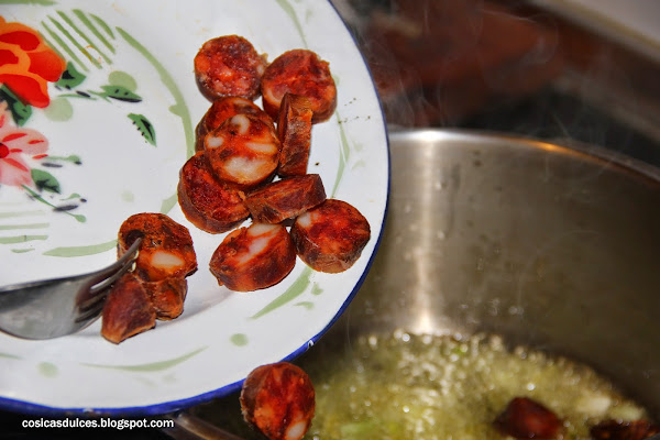 Cuando empiece a transparentar añadimos los tomates secos, el bacon a tiras y los chorizos.