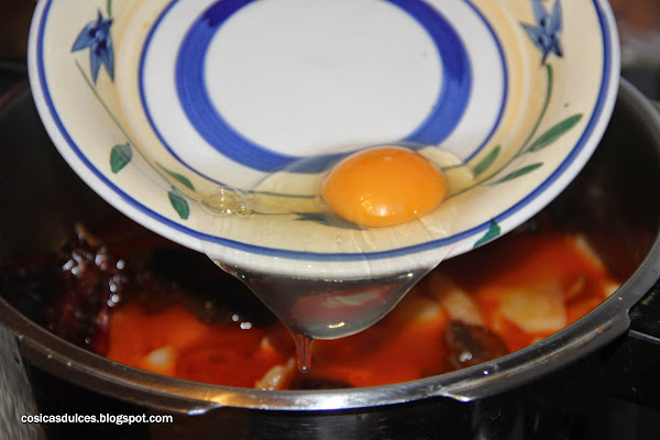 Tapamos la olla y dejamos cocinar sobre diez minutos (aunque el tiempo dependerá de cada olla). Pasado ese tiempo destapamos la olla y añadimos los huevos y dejamos cocinar ya con la olla destapada (los huevos deben quedar al puesto que guste; a mi me gusta que la yema siga blandita).