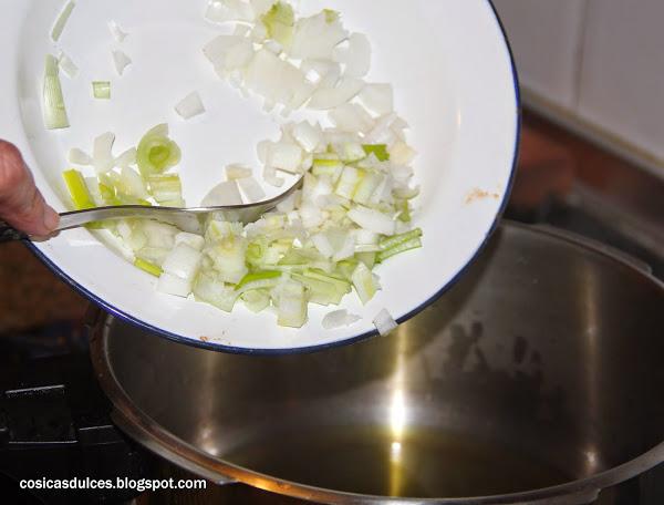 En una olla (la mía era rápida) vertemos el aceite. Cuando esté caliente añadimos la cebolla cortada a dados y los dientes de ajo laminados.