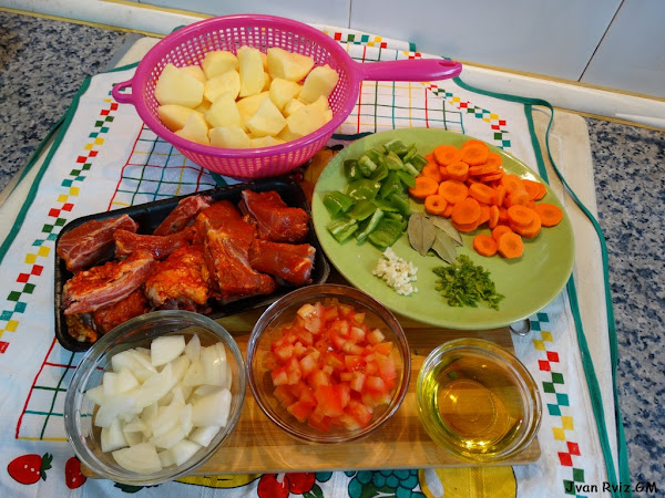 Sofreír la cebolla, el pimiento, la zanahoria, el tomate y antes de que doren añadir la carne, las patatas, el majado de ajo y perejil y rehogamos.