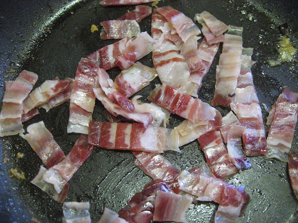 4º " Cortamos el Beicon a tiras y lo freímos hasta que nos quede crujiente, lo retiramos y reservamos encima de un papel de cocina para quitar el exceso de aceite.