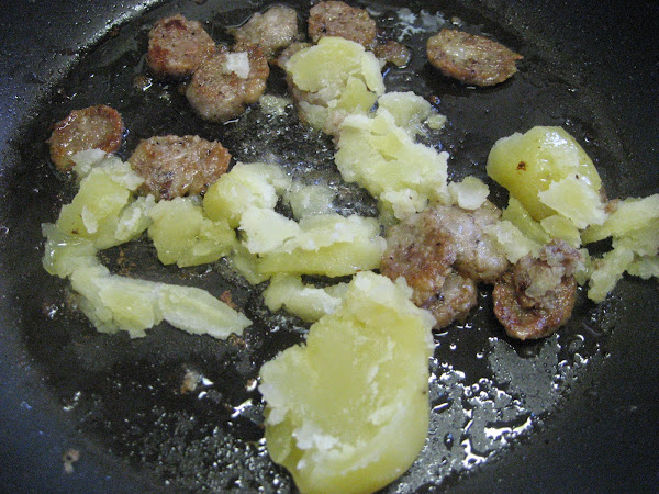 3º " La cortamos a rodajas y la pasamos por la sartén, tanto la de un color primero, como la del otro seguidamente, en cada una de las operaciones (freír la butifarra), colocamos una patata y media en cada uno de los colores, la chafamos como si quisiéramos hacer un puré y la sal pimentamos, reservamos cada color en un plato diferente.