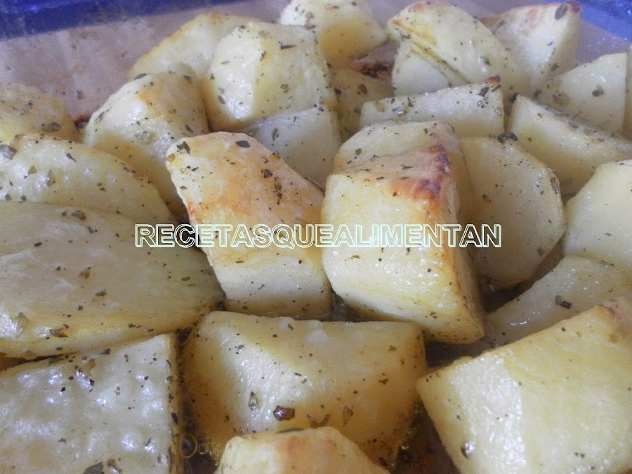Ahora, ponemos las patatas en una fuente de horno y horneamos a 180º C durante 35 minutos aproximadamente. Removemos las patatas pasados los primeros 10 minutos de horneado.