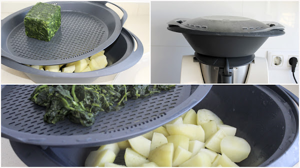 1.-Cocemos las espinacas y las patatas, pero lo hacemos por separado, ya que la patata tarda más tiempo en hacerse que las espinacas. Yo lo hice al vapor con el Varoma de la Thermomix, ya que así los ingredientes mantienen intactas sus propiedades.