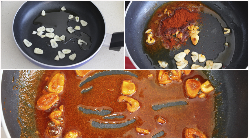2.-Una vez cocidas las patatas y las espinacas las escurrimos y reservamos en una fuente. Ponemos el aceite al fuego, pelamos los ajos, los cortamos a láminas y los rehogamos en el aceite caliente.