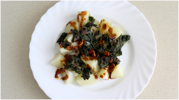 3.-Una vez dorados apartamos la sartén del fuego, agregamos el pimentón y la sal, removemos hasta que el pimentón se haya integrado y esparcimos por encima de las patatas y las espinacas. Espero que te guste y ¡buen provecho!