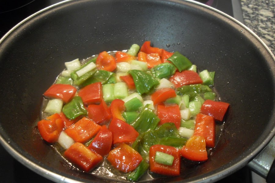 Añadir un poco de aceite a una cazuela y pochar el pimiento verde seguidamente del rojo y la cebolla.