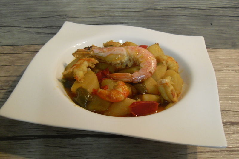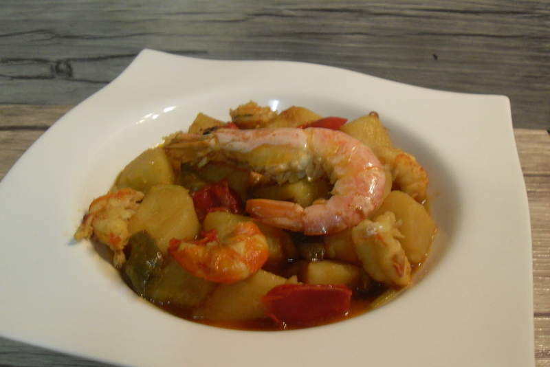 Servir seguidamente, colocando encima del plato un langostino salteado.