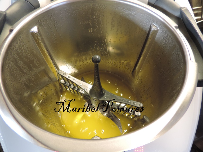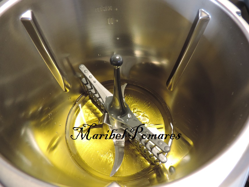 Ponemos el agua, aceite y la mariposa en las cuchillas del thermomix.
