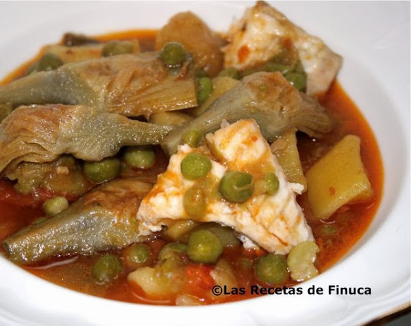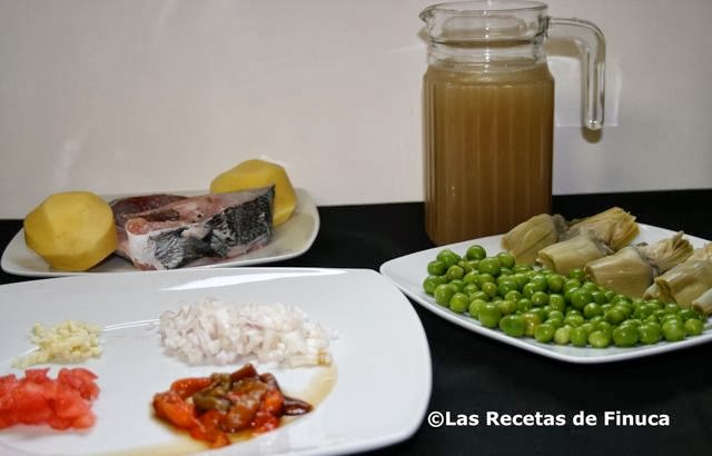 Lo normal es que las patatas se hagan en 20 minutos pero conviene pincharlas con un palillo para saber si están blandas. Cuando veamos que están a falta de poco tiempo, ponemos los guisantes y el pescado. El pescado se hará en 5 minutos, si lo hacemos más quedará muy seco. A los dos minutos de tener el pescado en la cazuela le damos la vuelta y añadimos las tiras de pimiento asado.