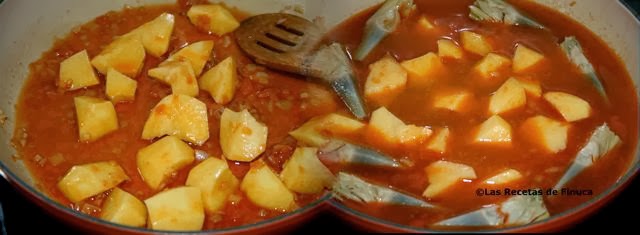 En una cazuela baja y amplia cubrimos su fondo con aceite de oliva virgen extra. Solo cubrir, no poner un dedo de aceite ;) En una vitrocerámica del 1 al 9 lo vamos a hacer en el 6. Picamos la cebolla y el ajo y echamos sobre el aceite cuando esté caliente. Cuando la cebolla esté transparente añadimos el tomate cortado en taquitos y las patatas que habremos lavado, pelado y cortado . Mezclamos bien, retiramos del fuego y añadimos una cucharada rasa (tamaño café) de pimentón. Revolvemos, volvemos a poner en el fuego y echamos caldo (que tendremos caliente). Añadimos las alcachofas.