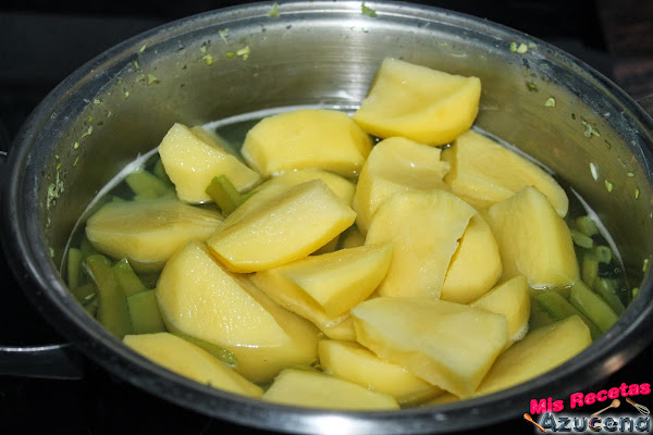 Una vez estén casi cocidas las patatas añadiremos un poco de sal y dejaremos que se termine cocer todo.