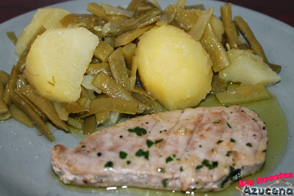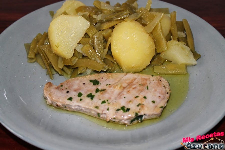 A la hora de servir pondremos en cada plato un solomillo de atún, judías y patatas a las cuales les pondremos unas gotas de limón y un chorreón de aceite de oliva.